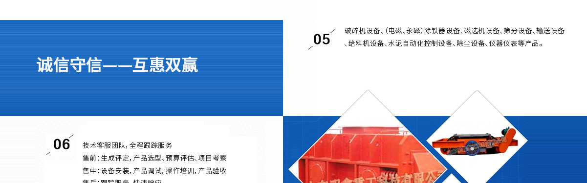 山東明鑫重工科技有限公司為是集科研開發,設計制造、銷售、安裝、調試為一體的技術制造企業。公司位于美麗的****風箏都-濰坊市(國家AAAA級森林公園-沂山景區駐地)臨朐東城工業園。本公司產品種類有:破碎機設備,(電磁、永磁)除鐵器設備,磁選機設備,篩分設備,輸送設備,給料機設備,水泥自動化控制設備、除塵設備,儀器儀表等產品。其產品有五十多個系列,四百多種規格,并可根據客戶需求設計生產相應的產品。其產品廣泛應用于冶金、電力、煤炭、礦山、造紙、食品、化工建材、耐火材料、磚瓦、水泥、玻璃等行業,產品暢銷國內三十多個省市、自治區。